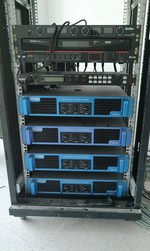 放大設(shè)備——指對(duì)經(jīng)過調(diào)控設(shè)備混音輸出、信號(hào)處理后的信號(hào)進(jìn)行后級(jí)功率放大設(shè)備,這里指專業(yè)功率放大器;重放設(shè)備——指將經(jīng)過后級(jí)功率放大器放大的音頻信號(hào)進(jìn)行電—聲轉(zhuǎn)換并釋放表現(xiàn)出來人耳可懂的聲頻信號(hào)的設(shè)備,這里指揚(yáng)聲器;