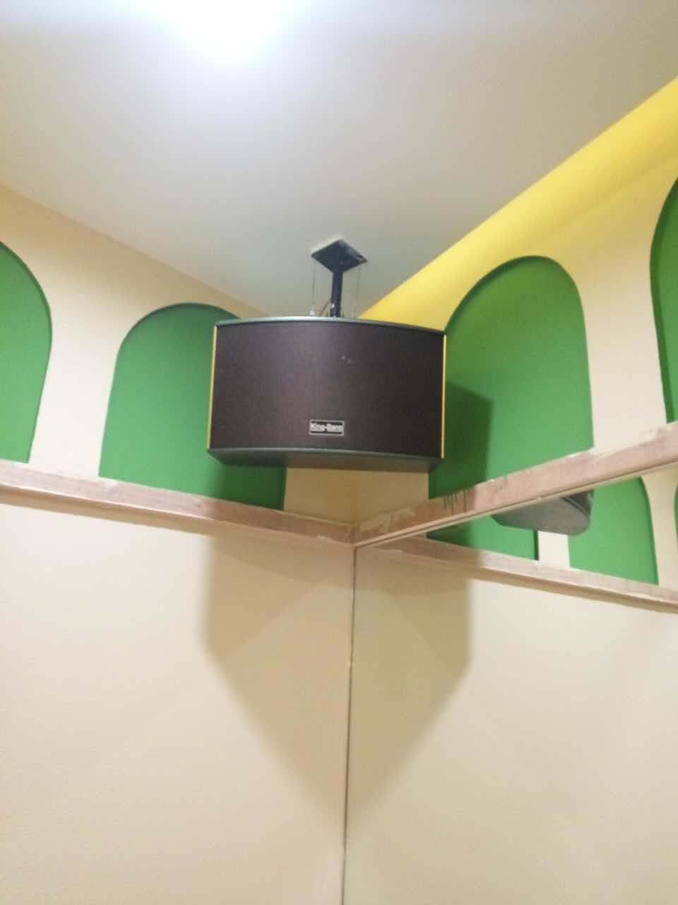 整個系統包括KT-10的兩分頻單10"卡包箱以及S-166的優質的天花喇叭,所有音箱由兩臺K-7500合并式功放500W,DSP-100的專業數碼HI房卡拉OK前級。整個系統主要用于背景音樂的播放。